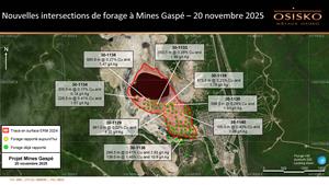 MONTRÉAL, 20 nov. 2025 (GLOBE NEWSWIRE) -- Osisko Metals Incorporated (la « Société » ou « Métaux Osisko ») (TSX : OM; OTCQX : OMZNF; FRANKFURT : 0B51) a le plaisir d’annoncer de nouveaux résultats de forage pour le projet de cuivre Mines Gaspé, situé dans la péninsule gaspésienne dans l’Est du Québec.